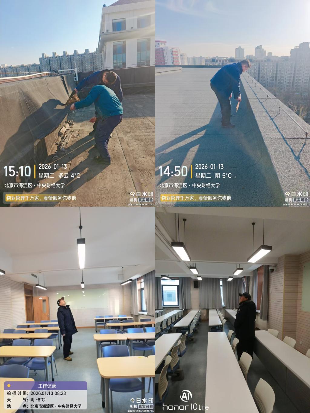 同时,物业服务部排查小组深入各楼宇室内公共区域,重点检查吊顶龙骨牢固性、天花板完好程度、照明灯具安装稳定性、风扇及投影仪悬挂装置紧固情况等,全力筑牢“脚下平安”防线。对发现的个别吊顶扣板松动、灯具固定不牢等问题,现场评估后立即组织修复;对无法当场处理的隐患,统一录入安全隐患台账,上报学校协调后续整改。